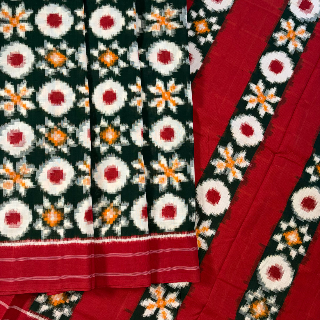 Green & Red Telia Rumal Double Ikat Cotton Saree
