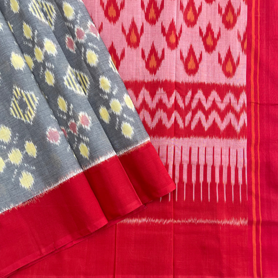Double Ikkat Mustard yellow & Grey Ikkat cotton Saree