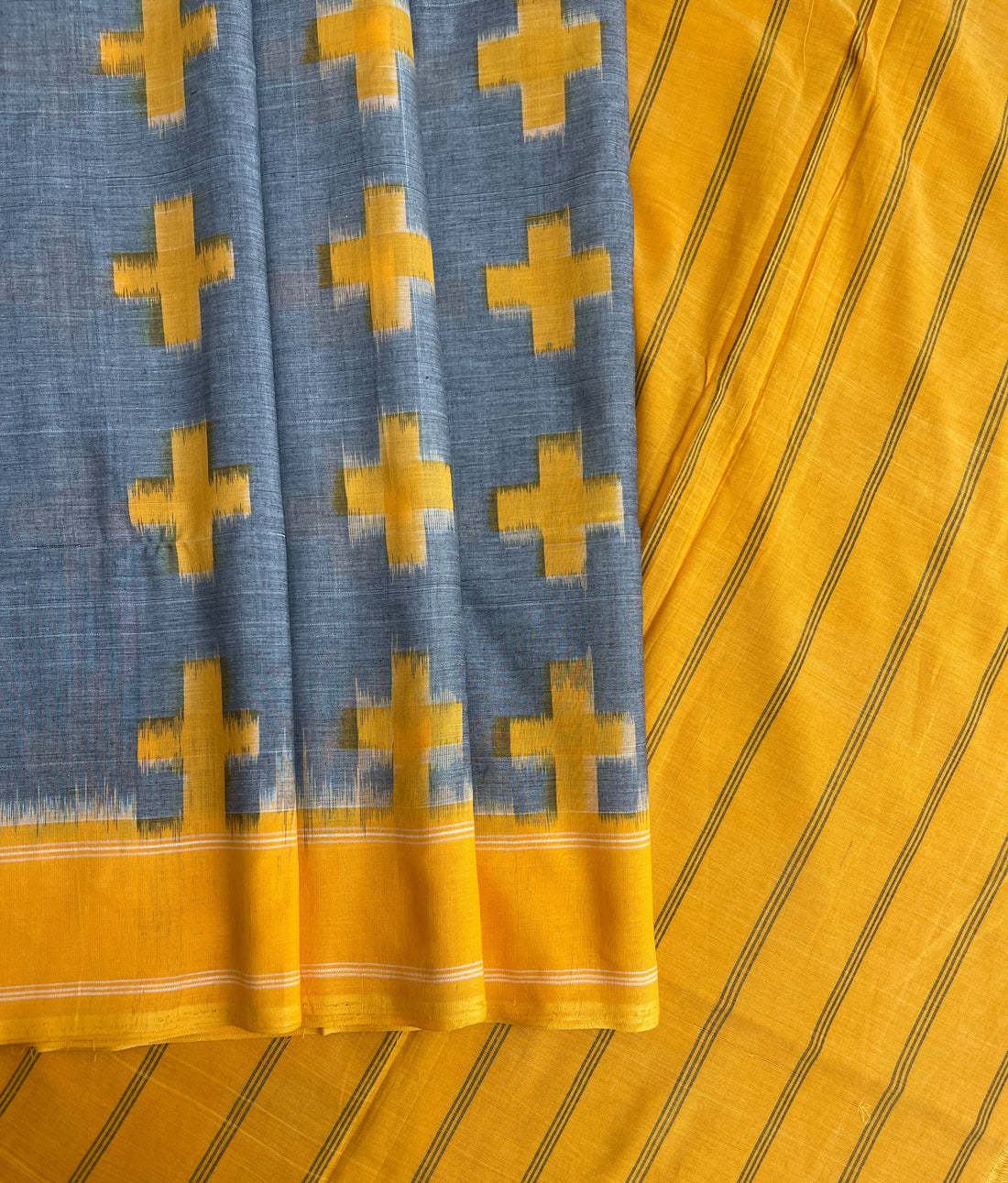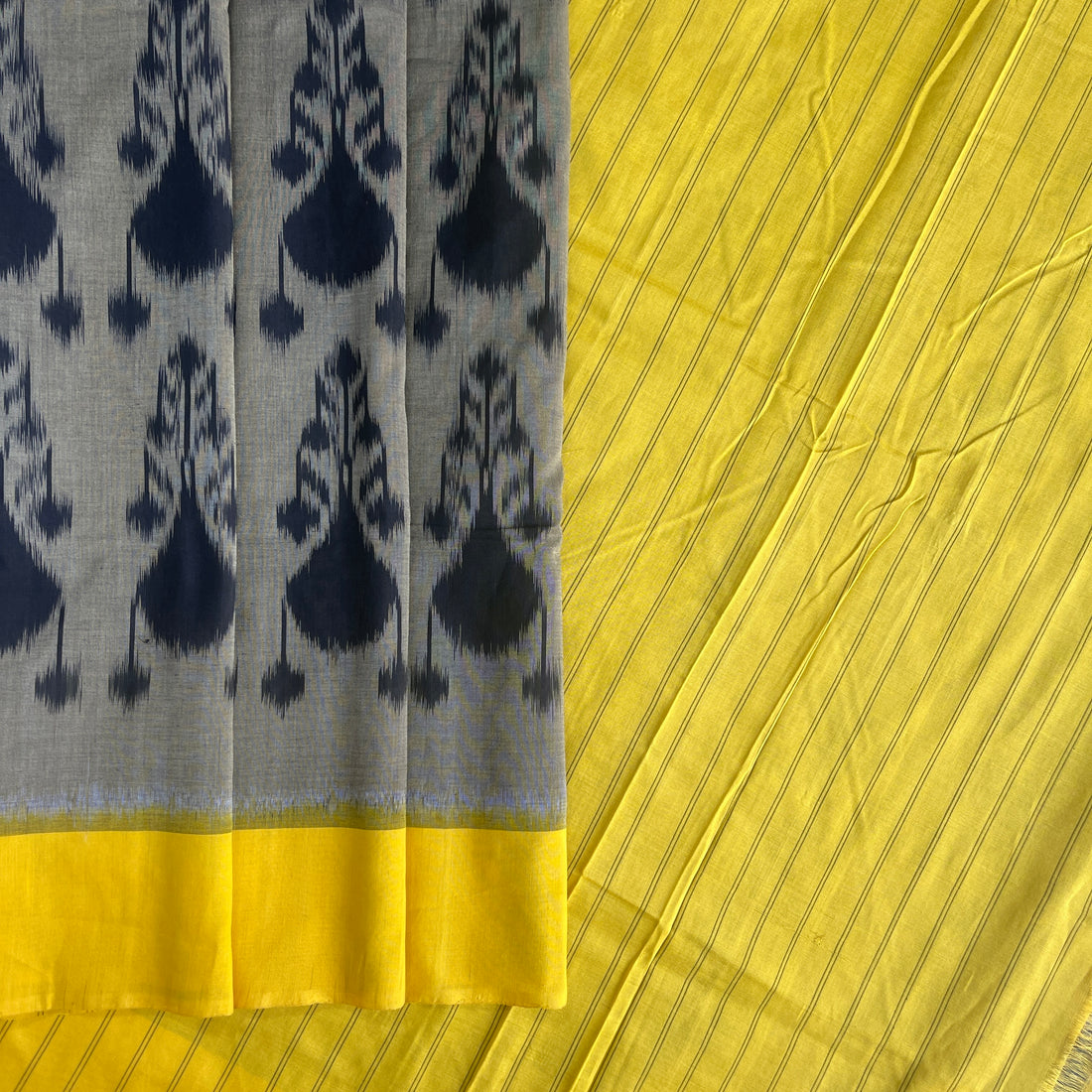 Double Ikkat Mustard yellow & Grey Ikkat cotton Saree