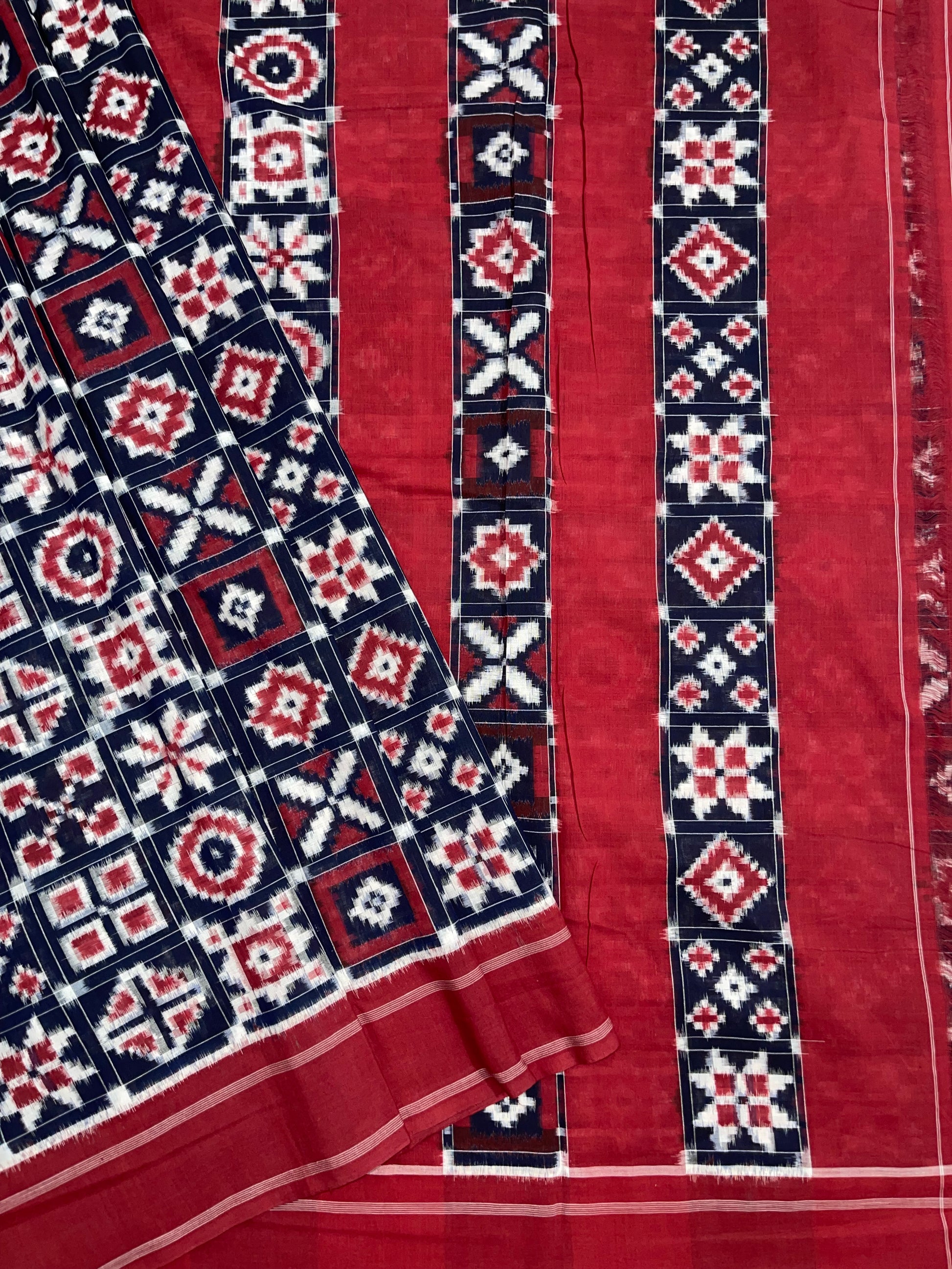 intricate patterns created through a unique dyeing technique called "Ikkat." In Ikkat weaving, the yarns are tie-dyed before weaving to create stunning, pre-determined patterns — a process that requires high skill and precision.