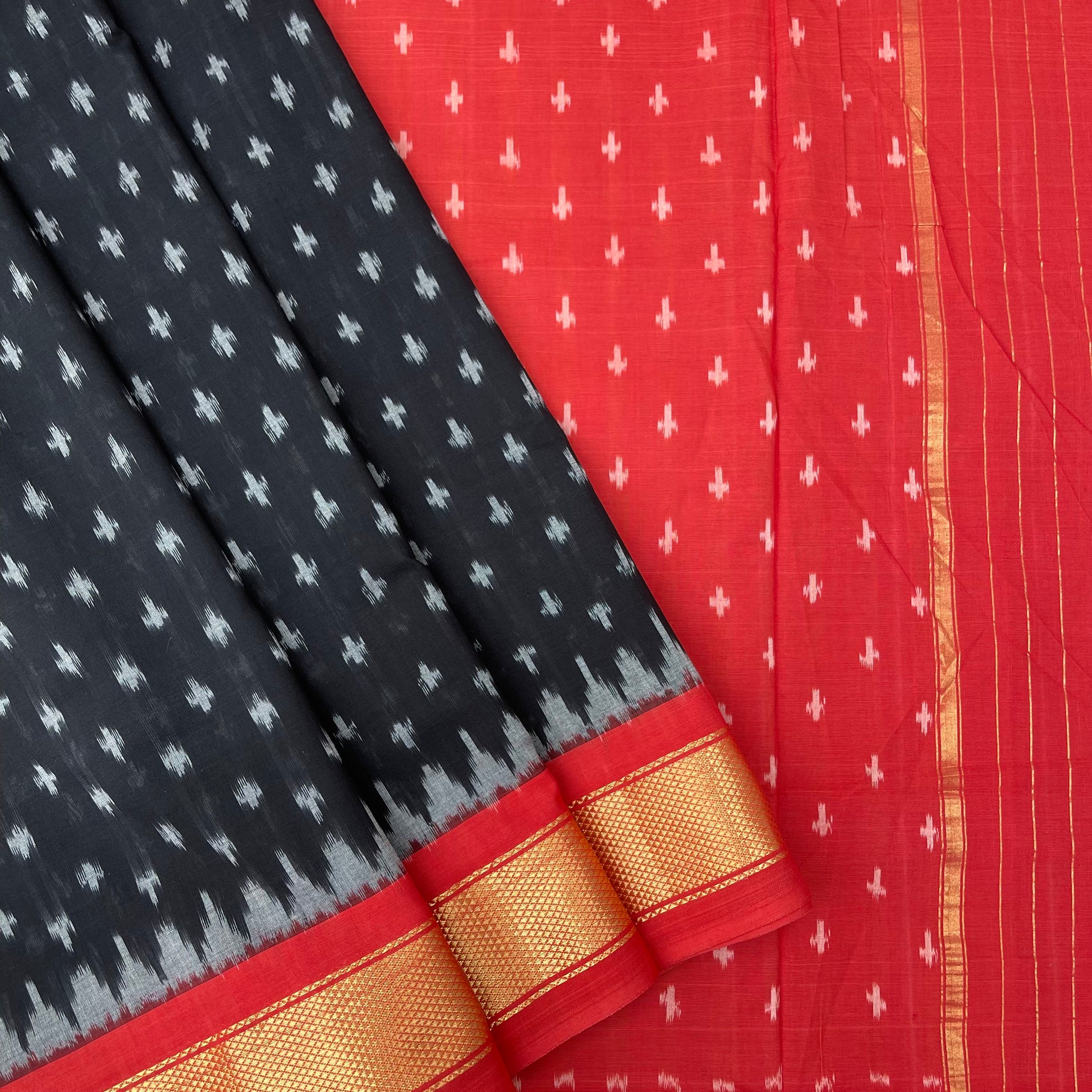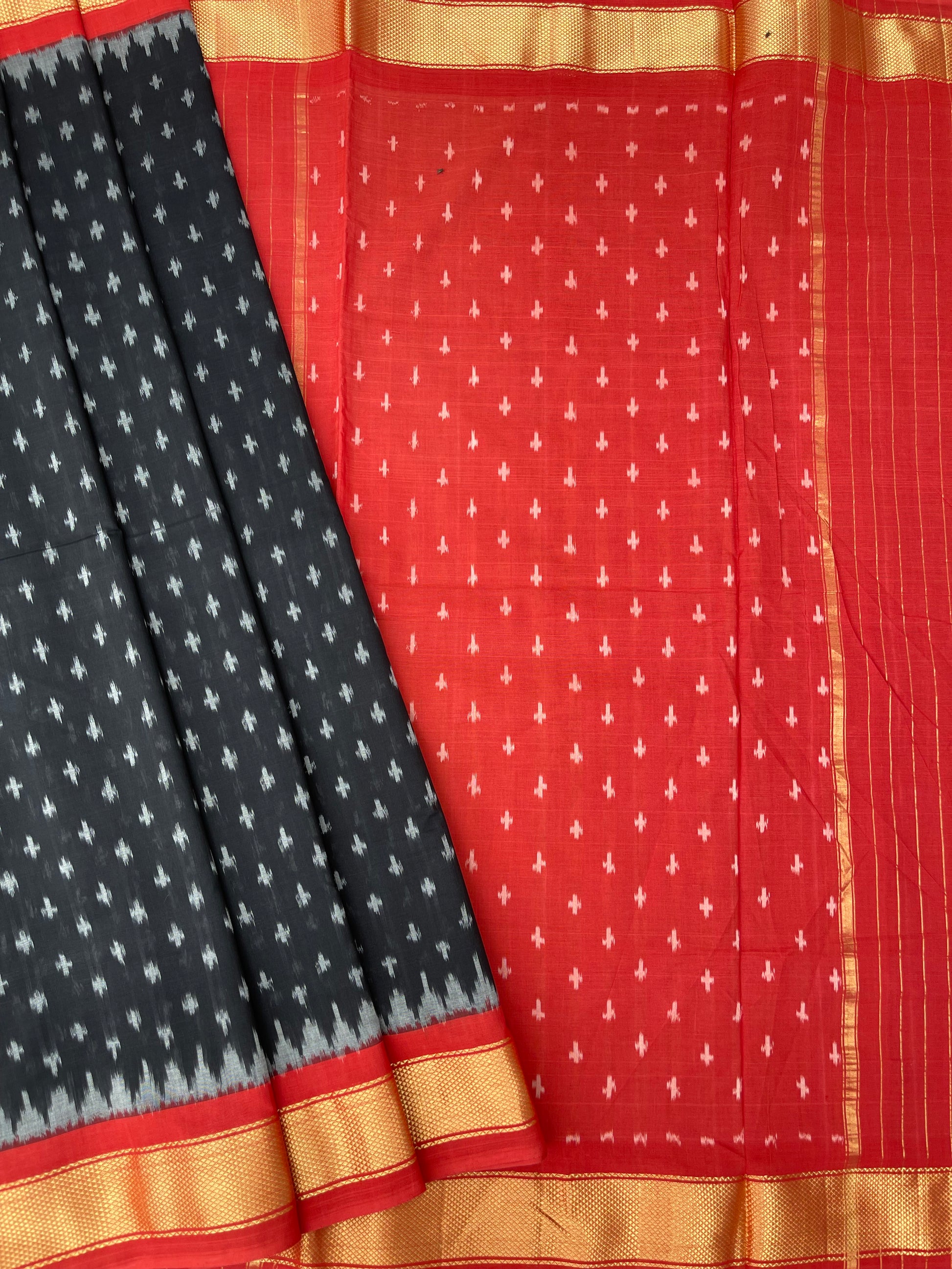 Black & Red Ikkat cotton Sari with zari