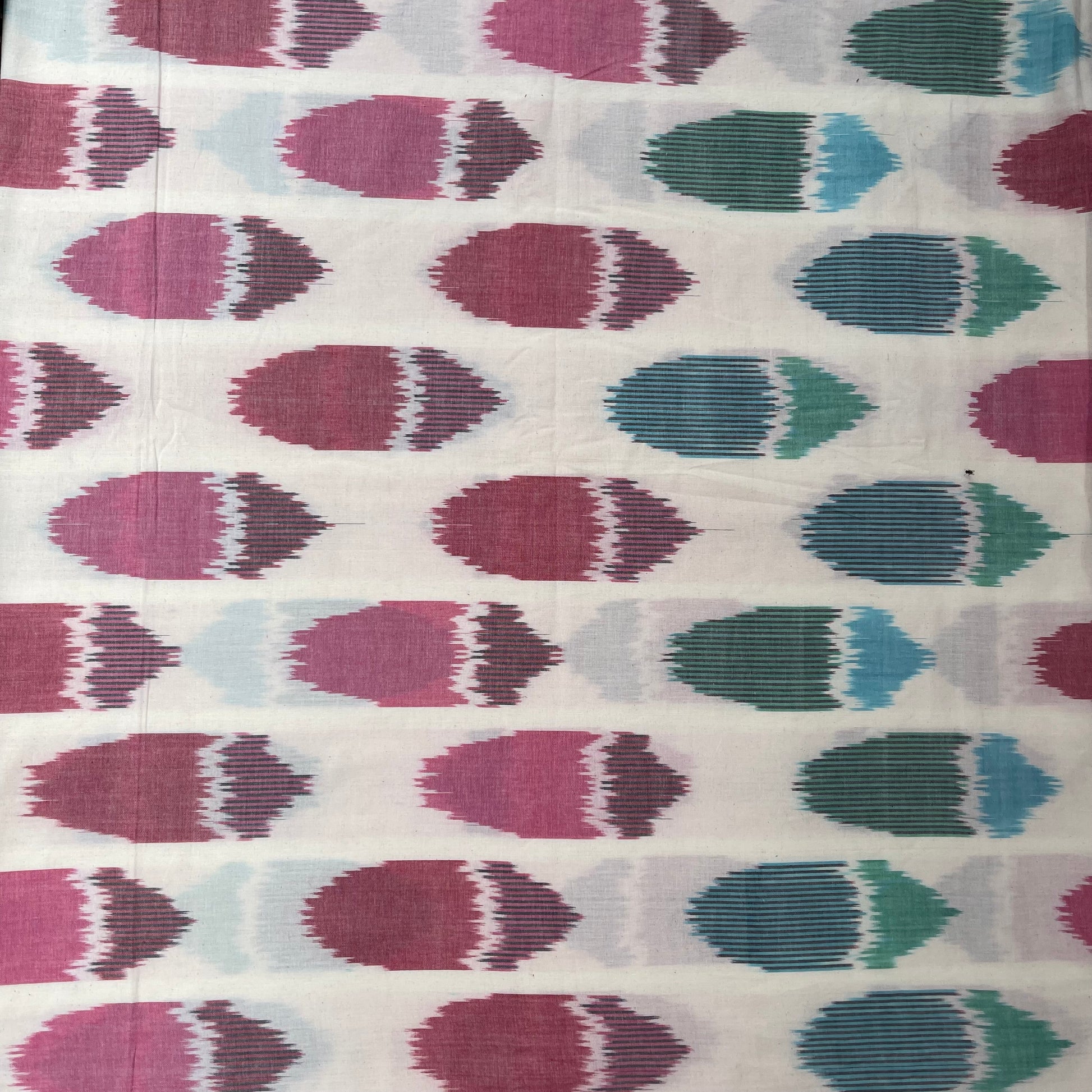 This textile is a proud part of the Pochampally Ikkat tie & dye tradition, known for its vibrant patterns and precise craftsmanship. Woven with pure cotton, the fabric reflects the perfect blend of Indian technique and Central Asian design inspiration, capturing the bold and symmetrical motifs often seen in Uzbek ikats.