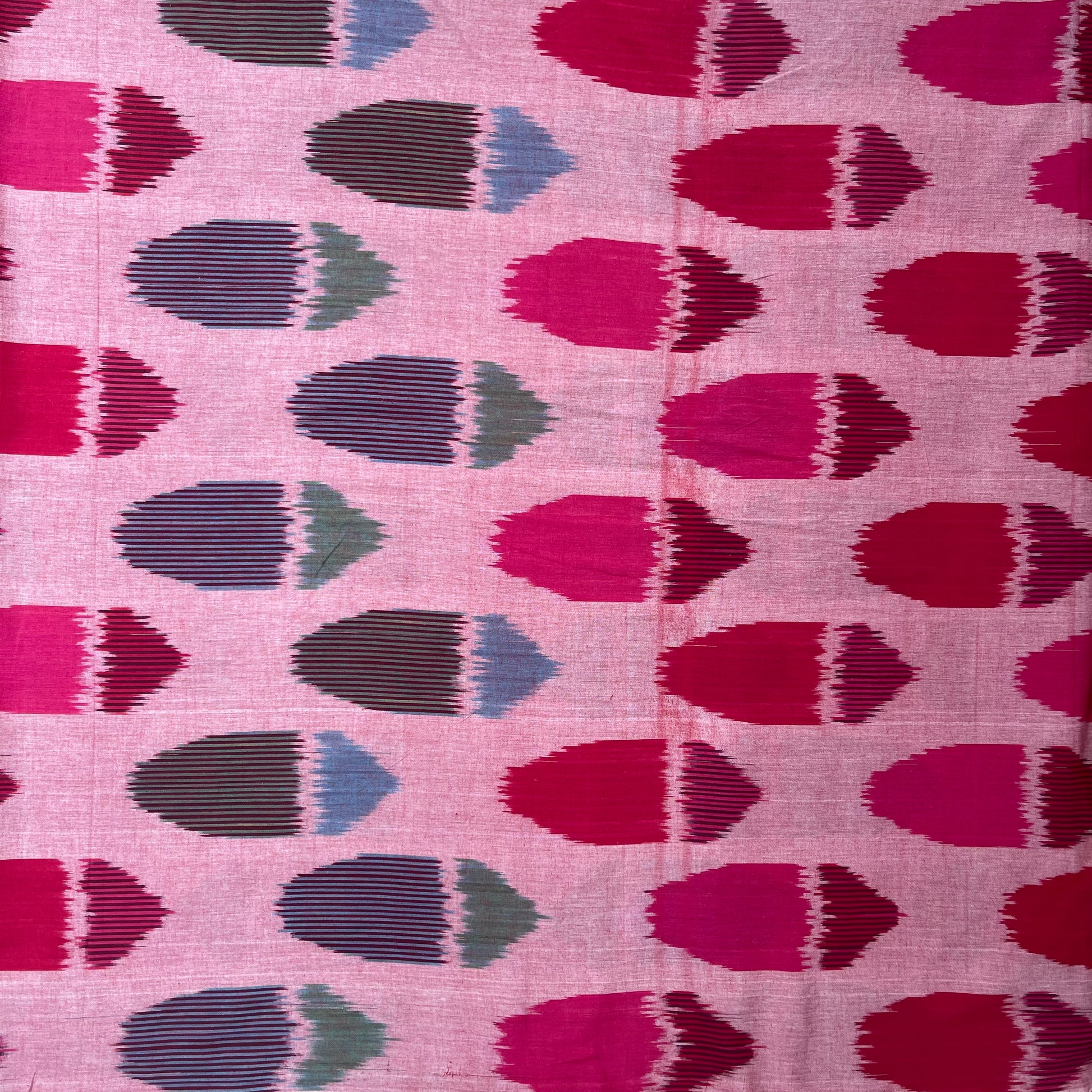 This textile is a proud part of the Pochampally Ikkat tie & dye tradition, known for its vibrant patterns and precise craftsmanship. Woven with pure cotton, the fabric reflects the perfect blend of Indian technique and Central Asian design inspiration, capturing the bold and symmetrical motifs often seen in Uzbek ikats.