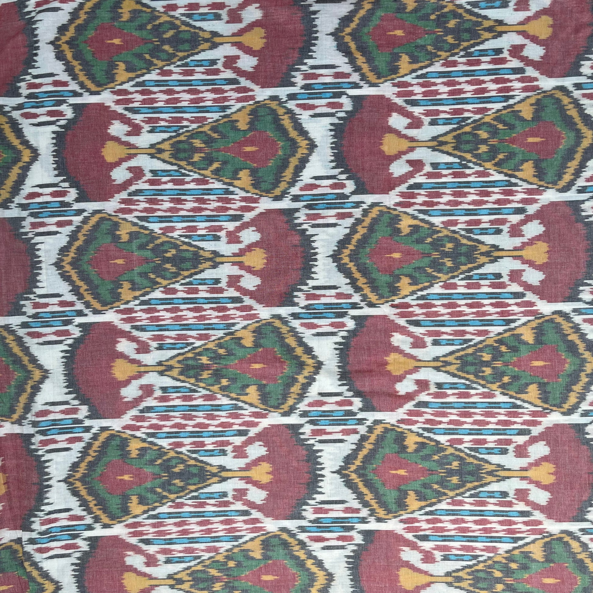 This textile is a proud part of the Pochampally Ikkat tie & dye tradition, known for its vibrant patterns and precise craftsmanship. Woven with pure cotton, the fabric reflects the perfect blend of Indian technique and Central Asian design inspiration, capturing the bold and symmetrical motifs often seen in Uzbek ikats.