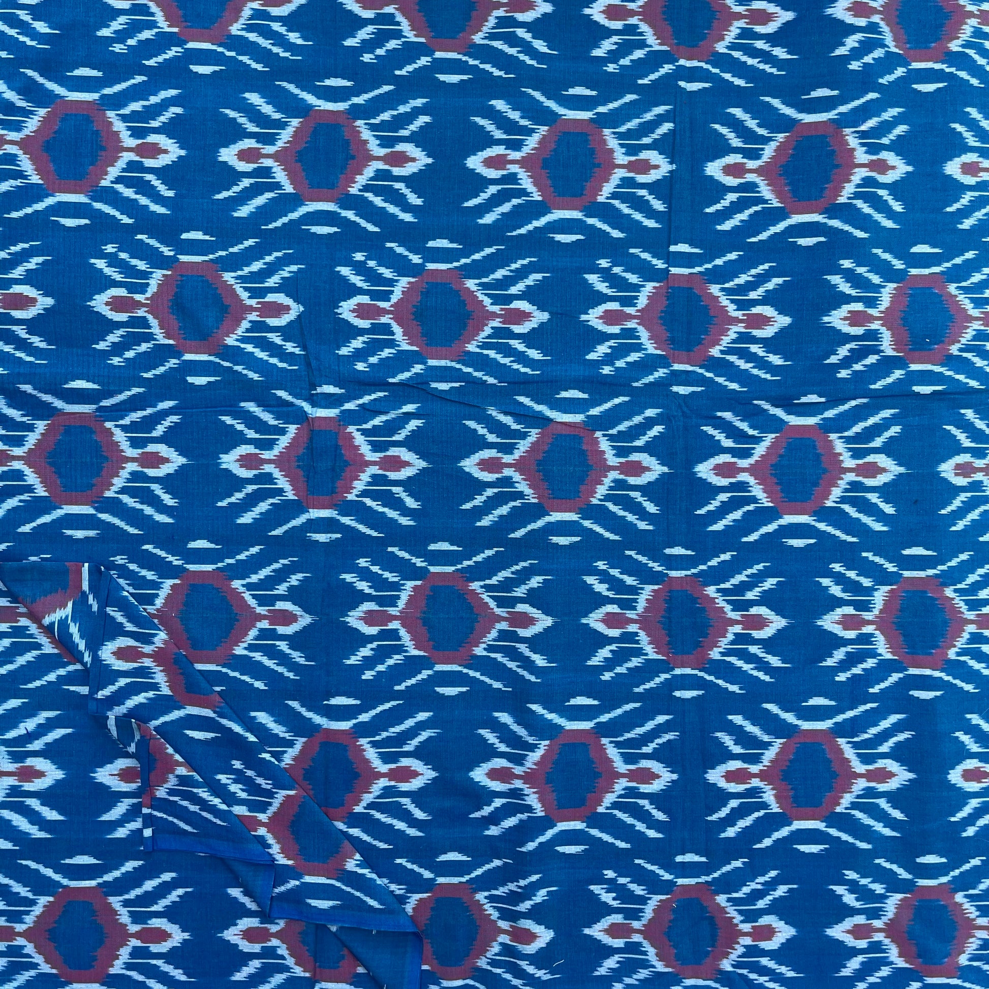 This textile is a proud part of the Pochampally Ikkat tie & dye tradition, known for its vibrant patterns and precise craftsmanship. Woven with pure cotton, the fabric reflects the perfect blend of Indian technique and Central Asian design inspiration, capturing the bold and symmetrical motifs often seen in Uzbek ikats.
