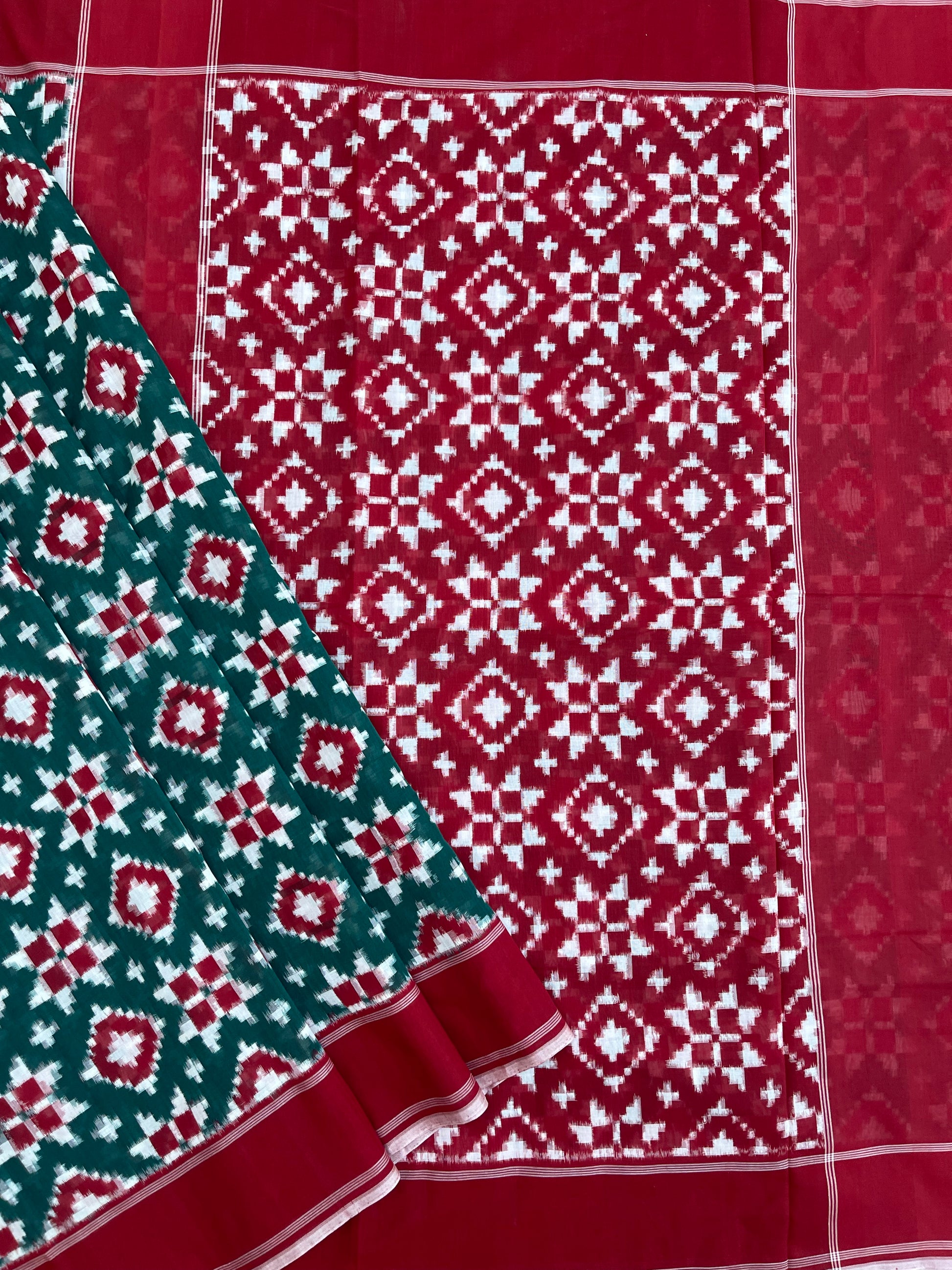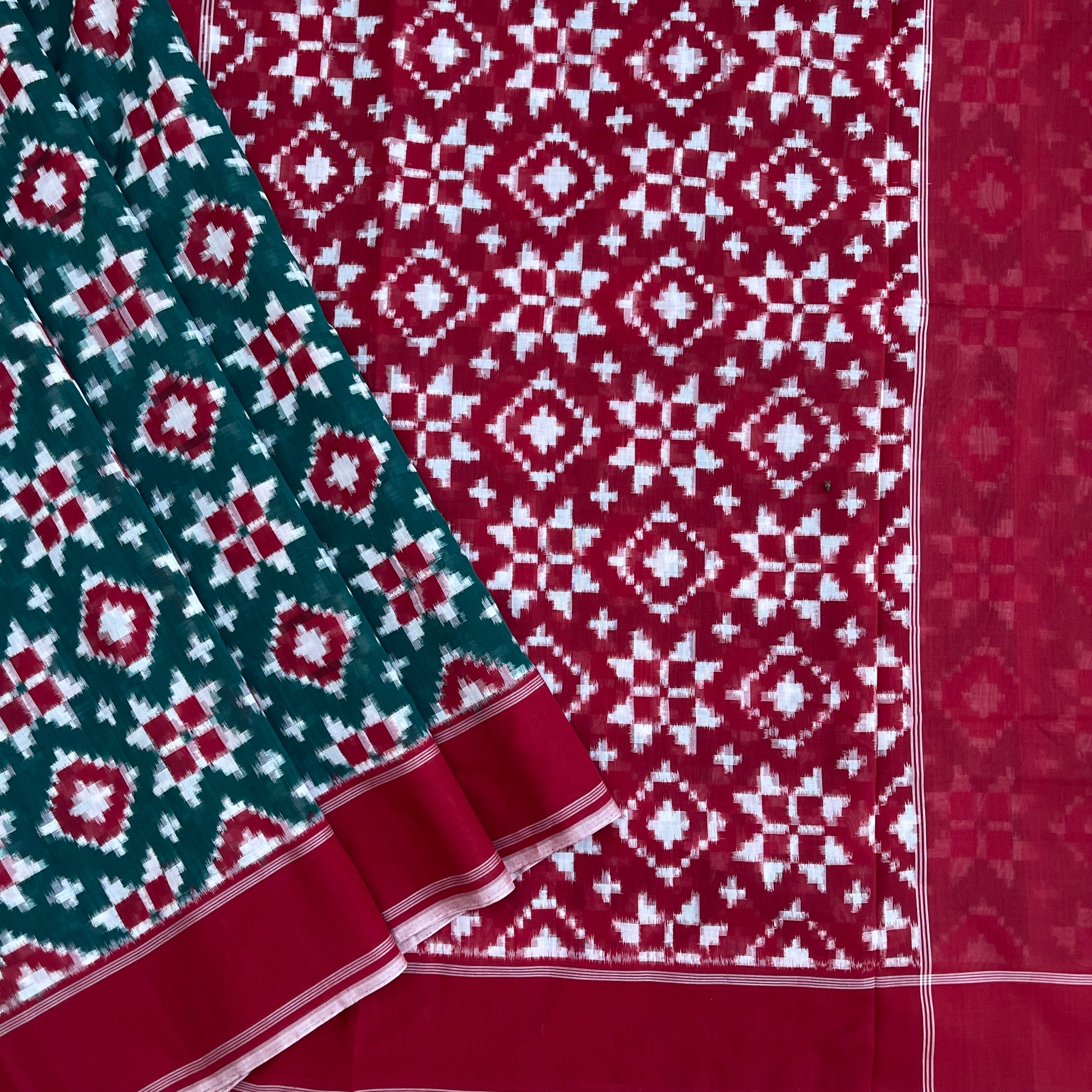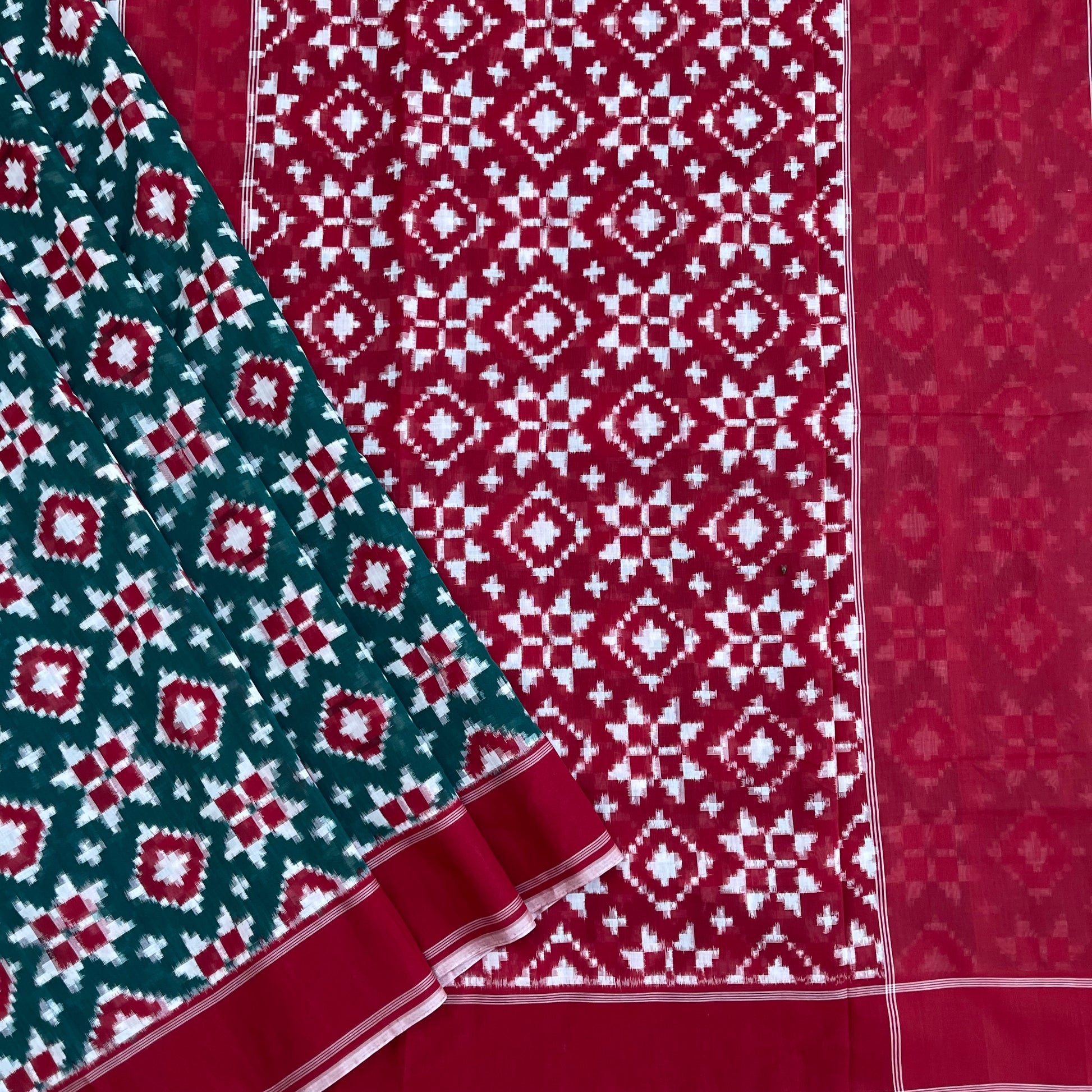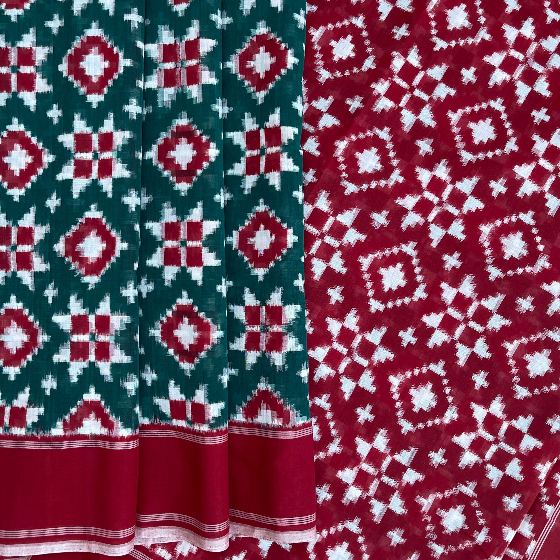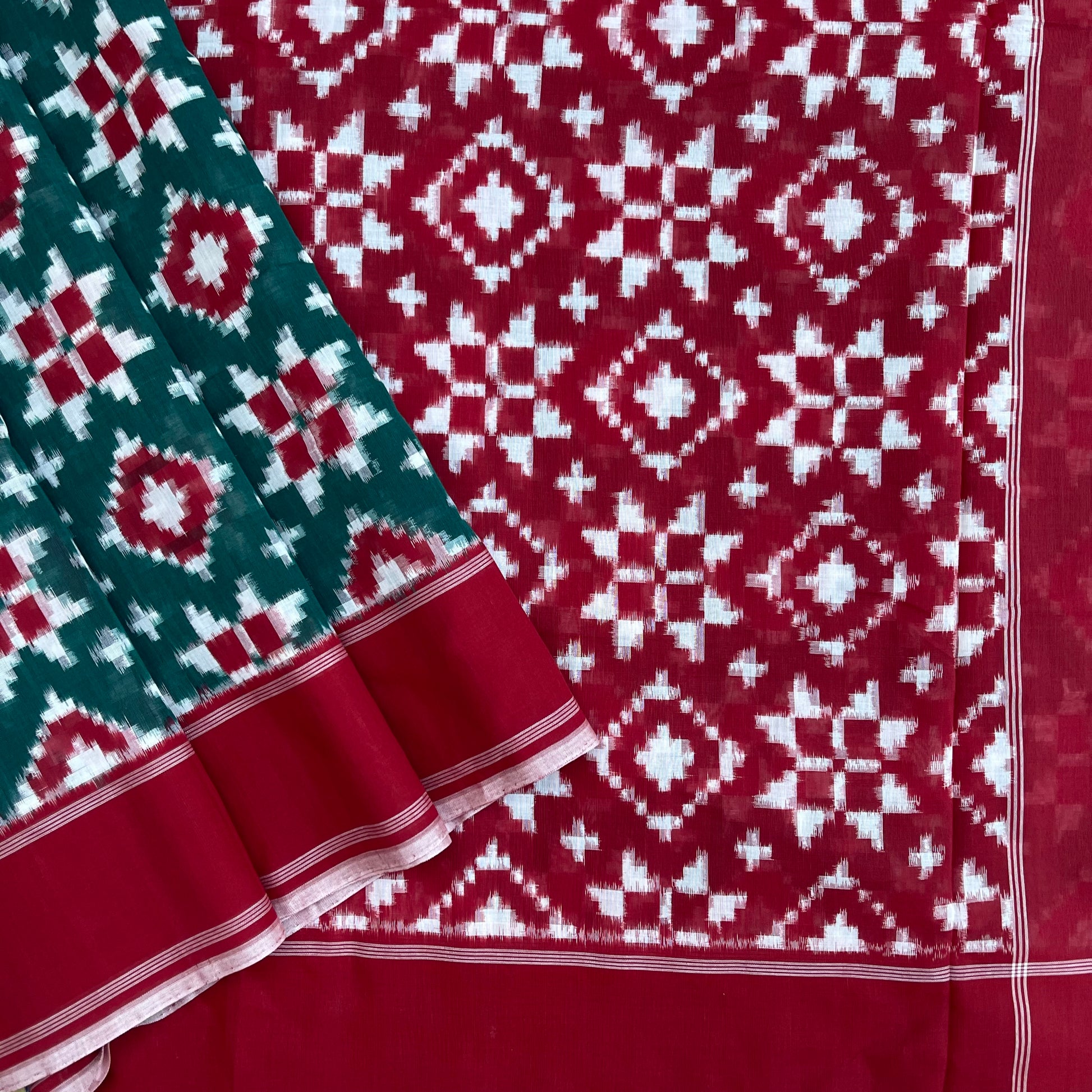 A timeless Black Telia Rumal Cotton Saree, showcasing the rich heritage of traditional handloom weaving. This saree is a classic example of the intricate Telia Rumal craft, known for its precise geometric patterns and deep cultural roots.