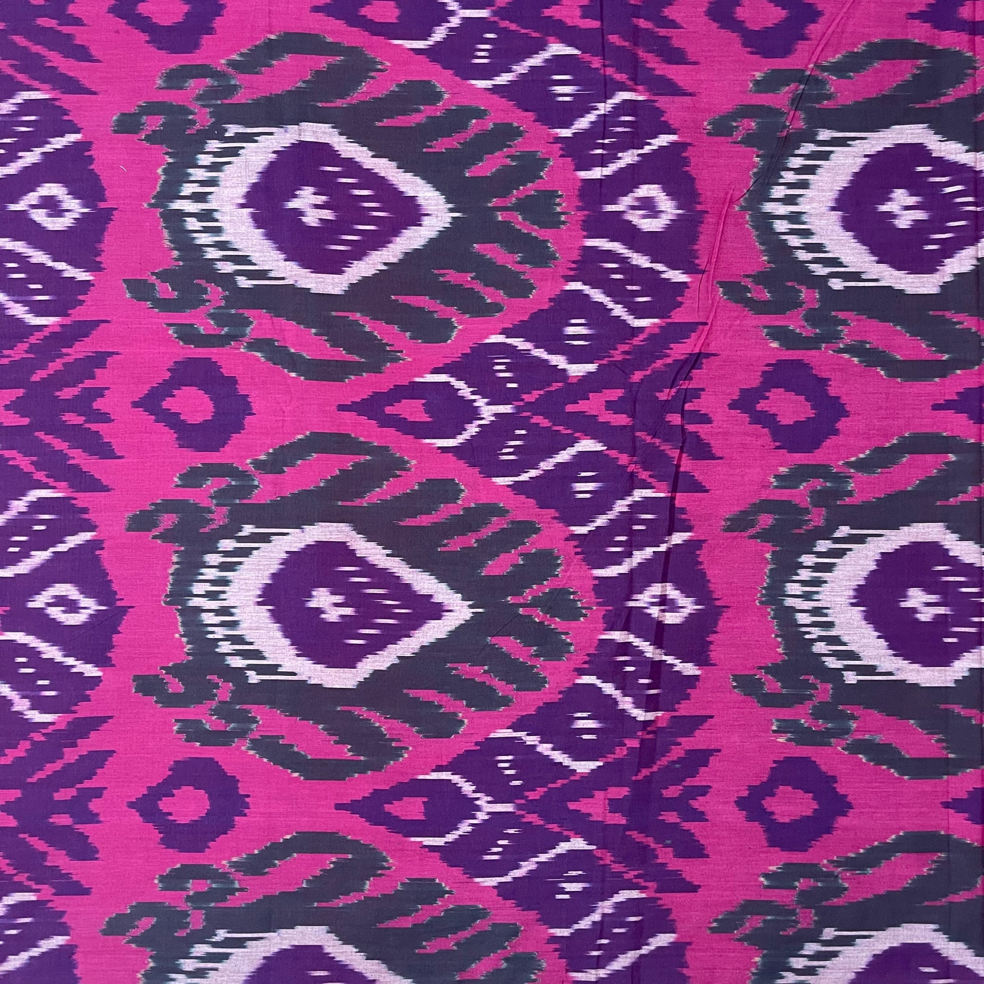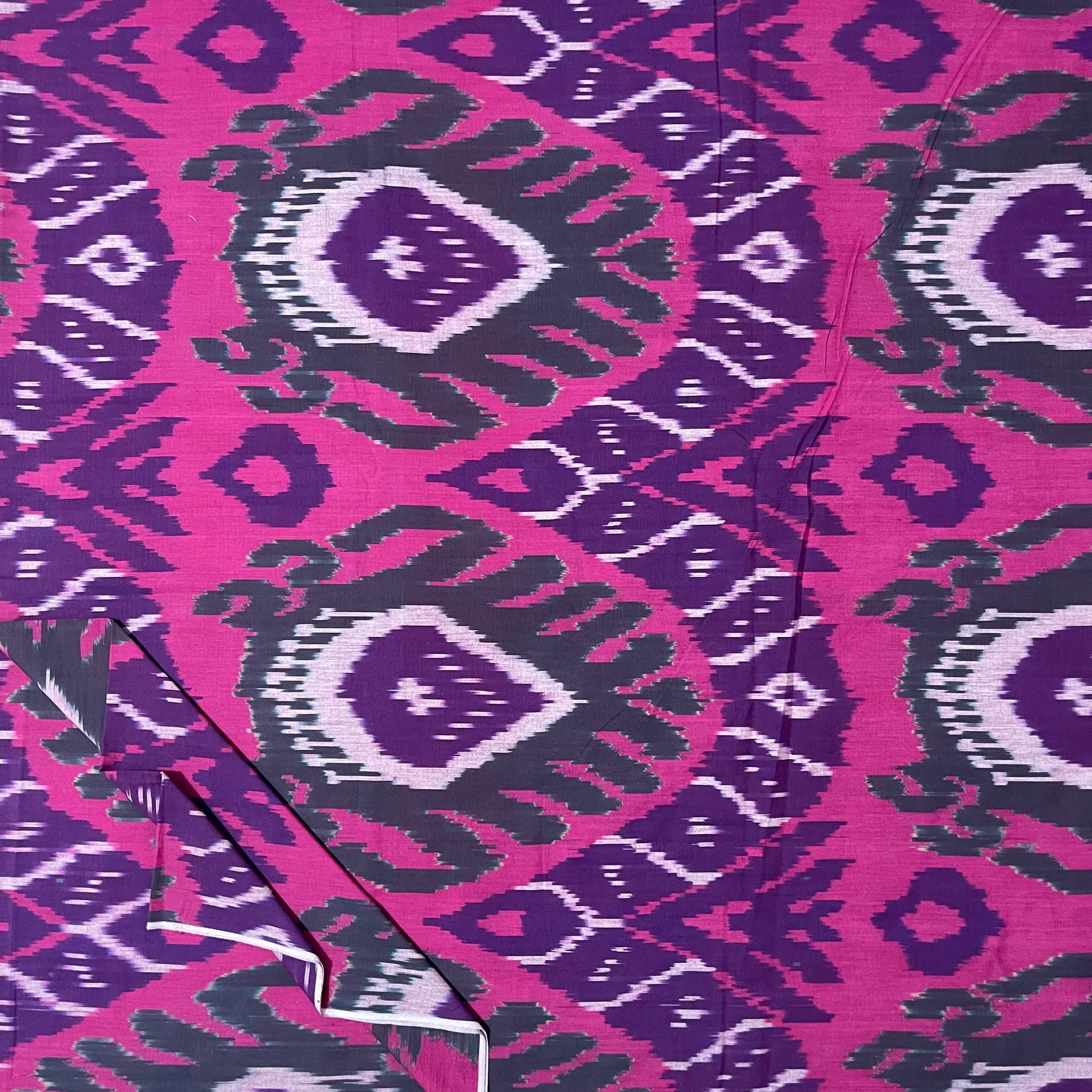 This textile is a proud part of the Pochampally Ikkat tie & dye tradition, known for its vibrant patterns and precise craftsmanship. Woven with pure cotton, the fabric reflects the perfect blend of Indian technique and Central Asian design inspiration, capturing the bold and symmetrical motifs often seen in Uzbek ikats.