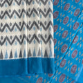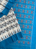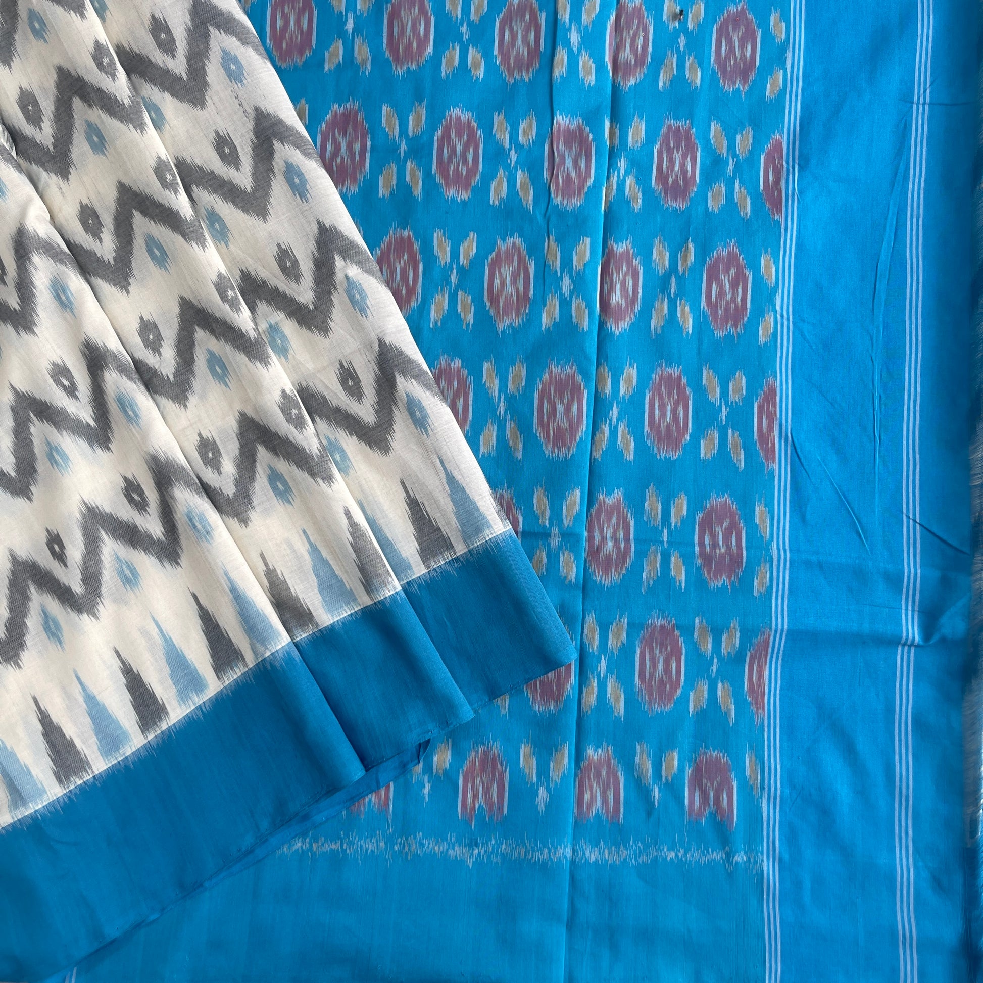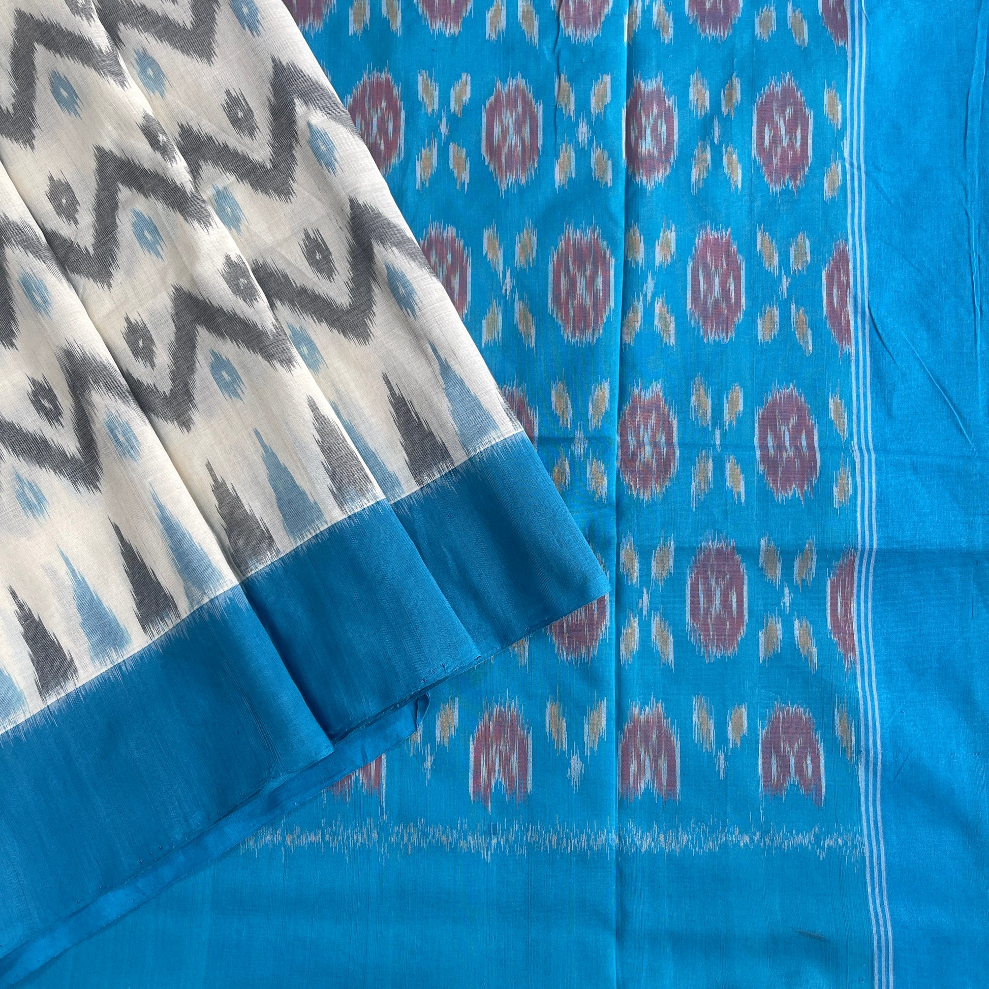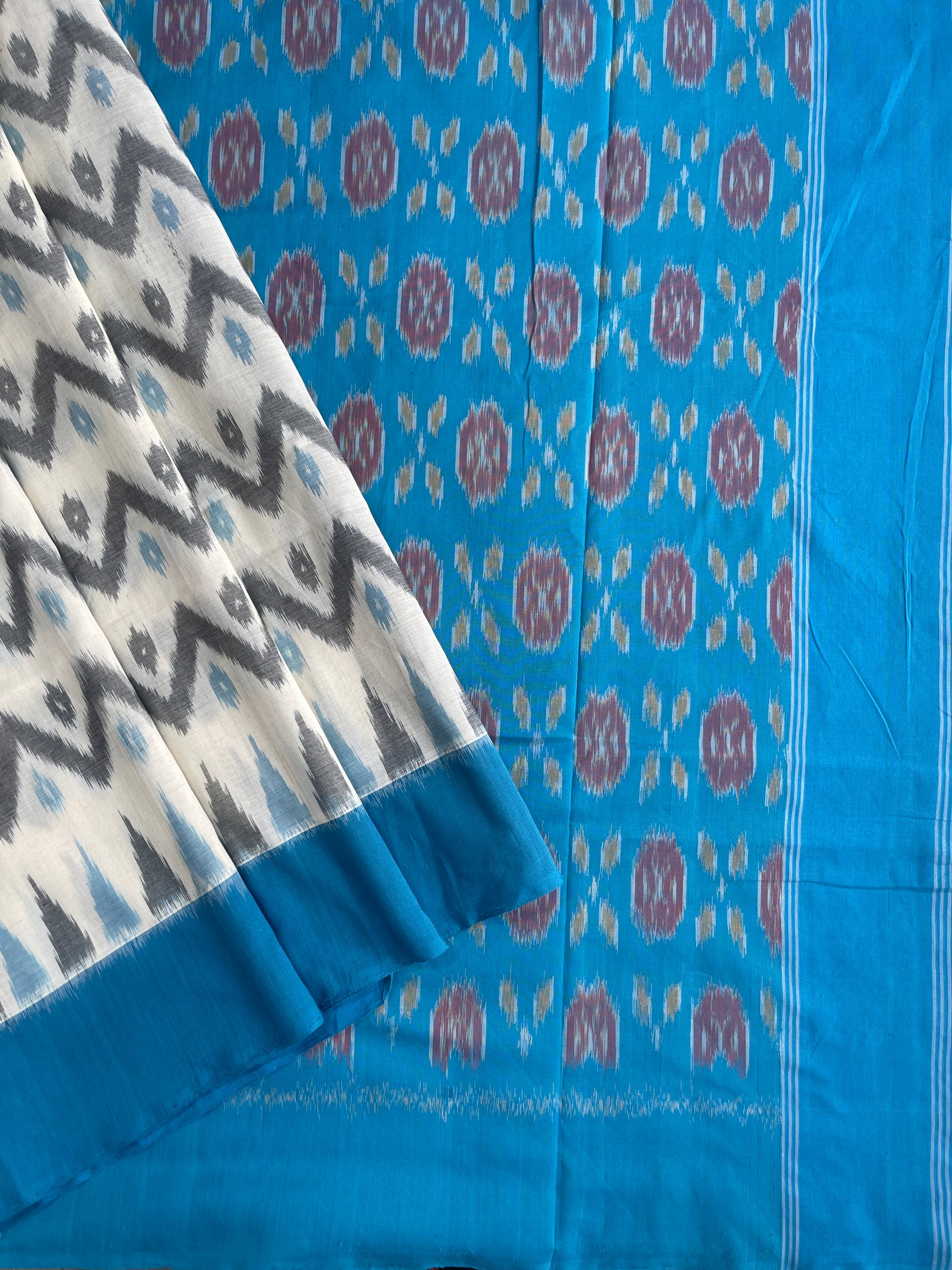 A Exclusive Handwoven ikkat cotton Saree in off white base on Grey chervon has woven and border and pallu has woevn in sky blue