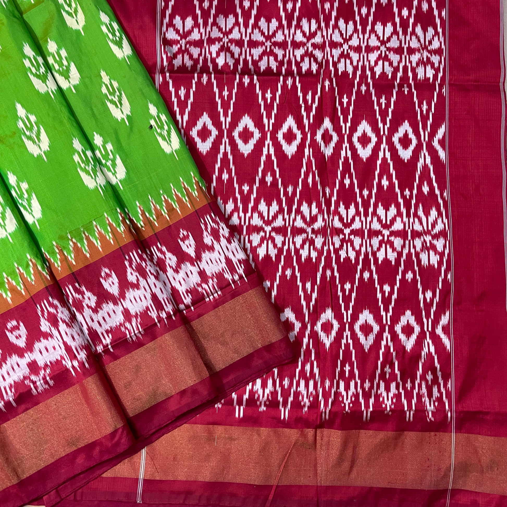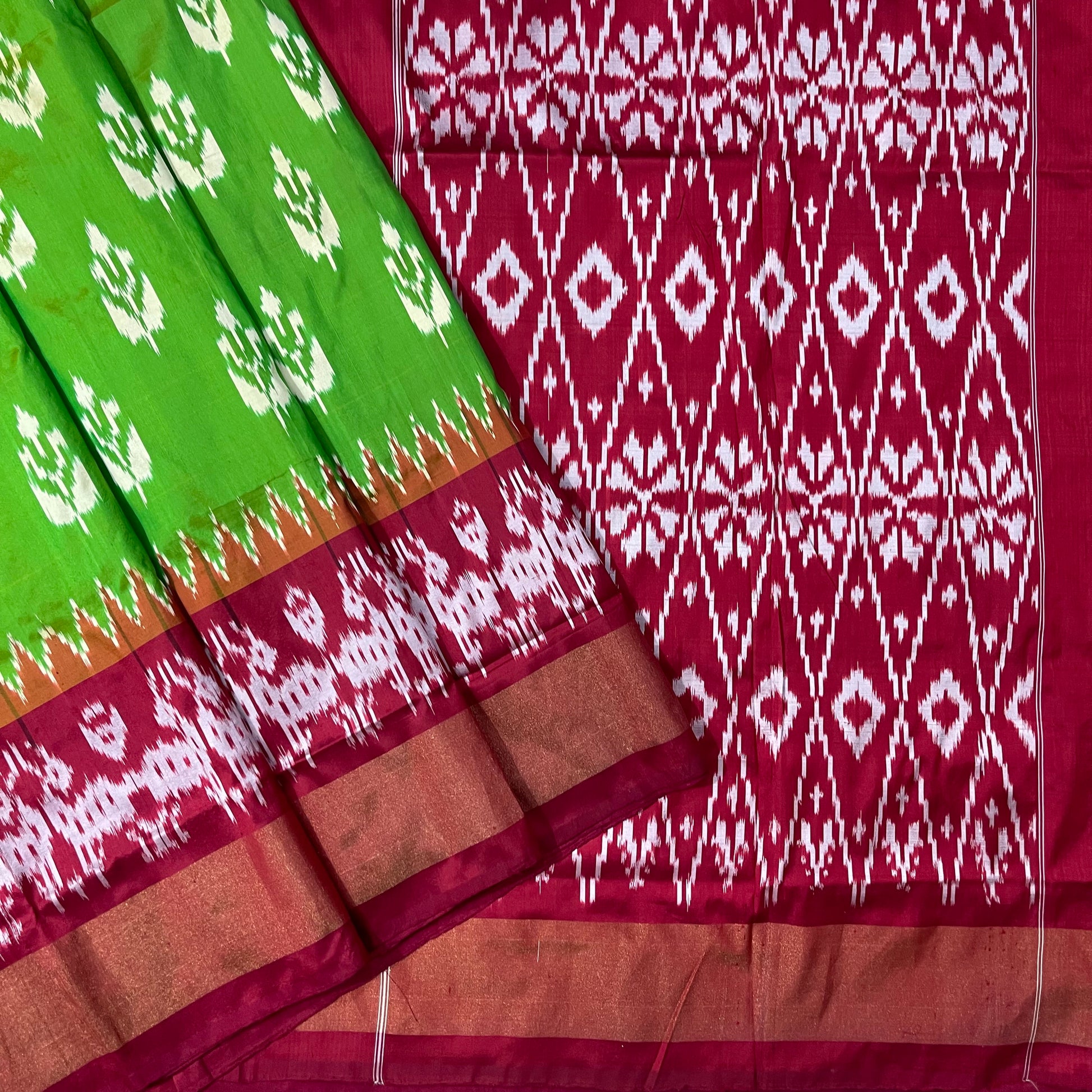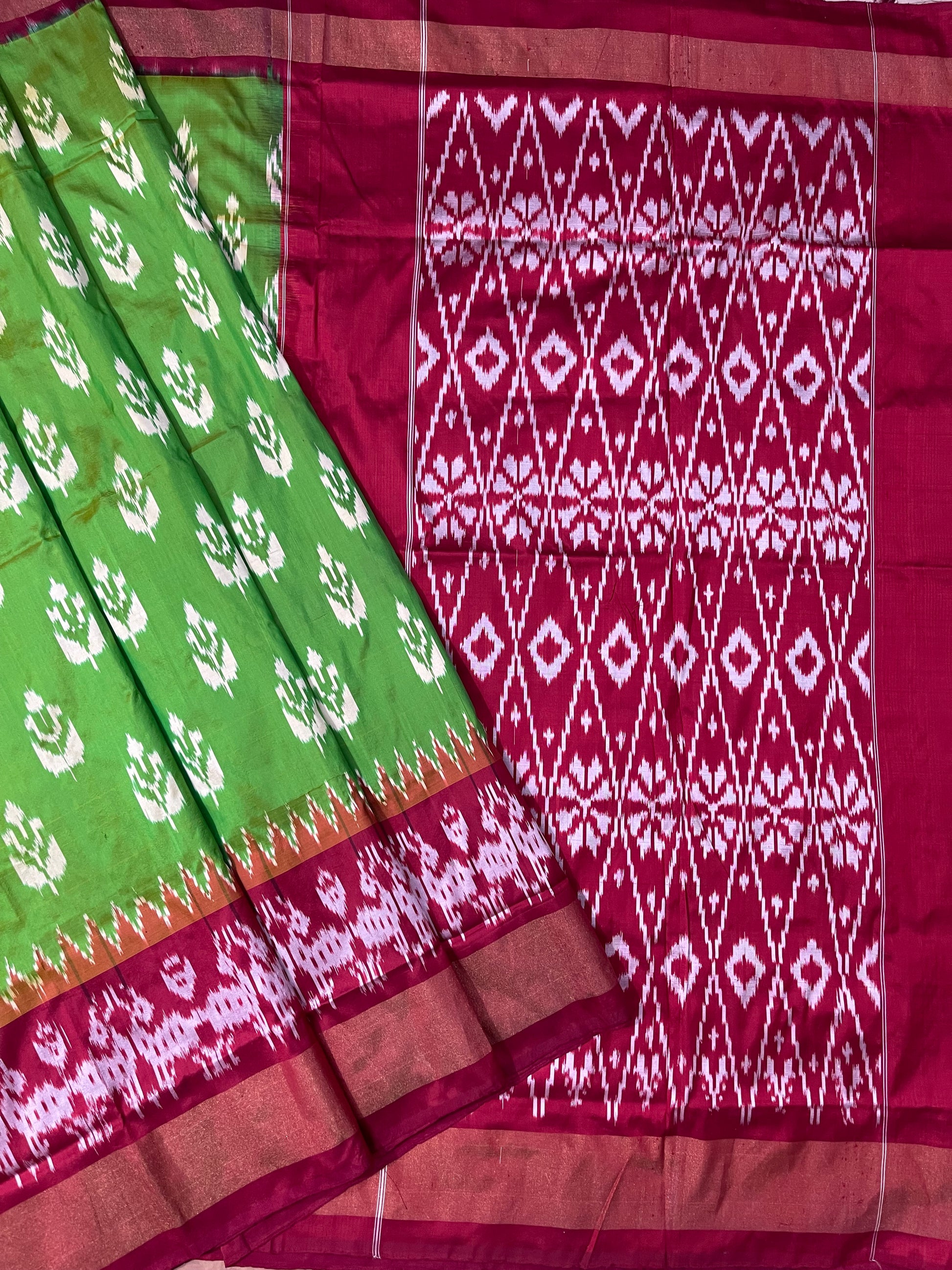 Step into the world of timeless tradition and vibrant artistry with this Ikkat mubbery Silk Saree, a true masterpiece of handwoven heritage. Crafted with precision by skilled artisans, this saree showcases the rich cultural legacy of Ikkat weaving, known for its intricate dyeing technique and bold, geometric patterns.