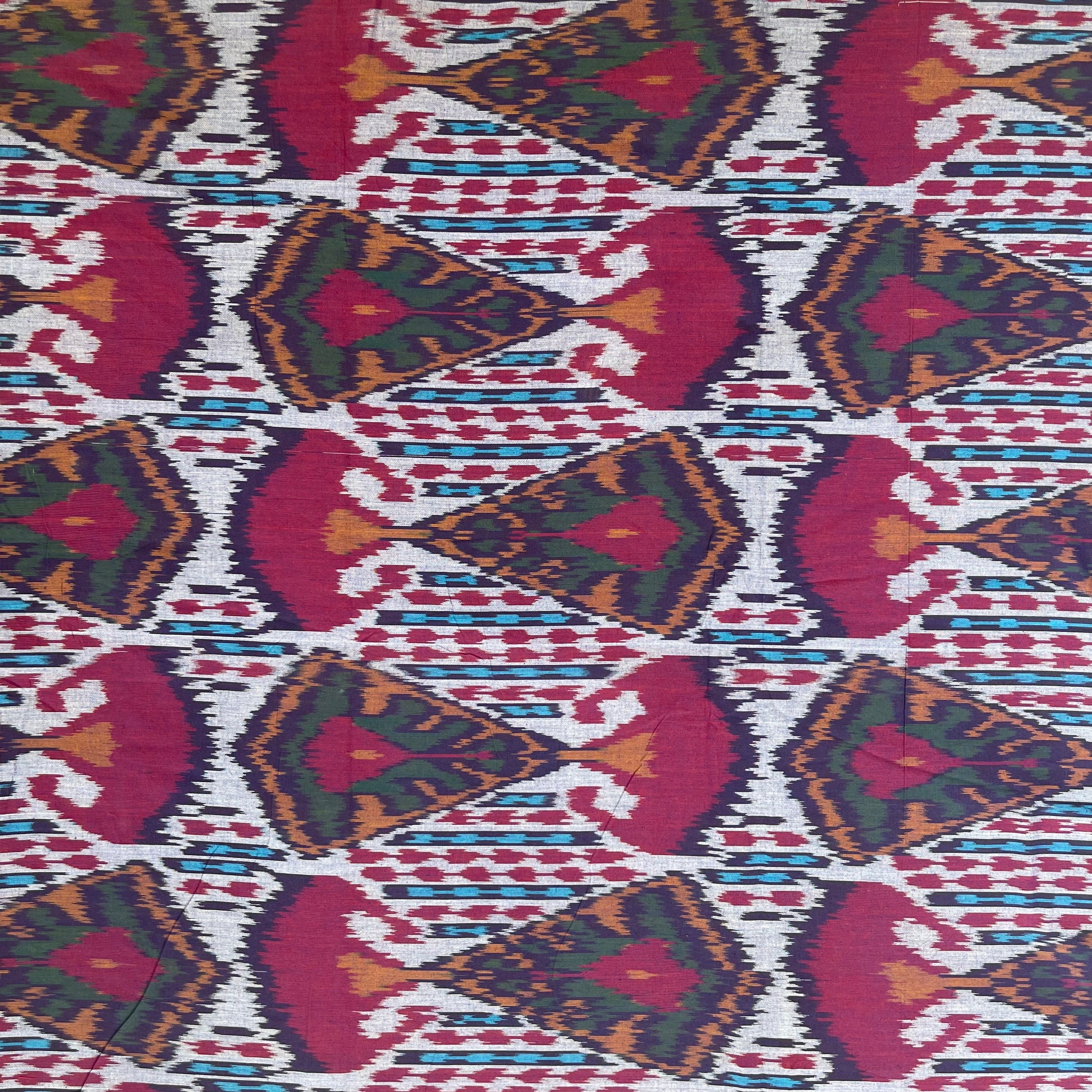 This textile is a proud part of the Pochampally Ikkat tie & dye tradition, known for its vibrant patterns and precise craftsmanship. Woven with pure cotton, the fabric reflects the perfect blend of Indian technique and Central Asian design inspiration, capturing the bold and symmetrical motifs often seen in Uzbek ikats.