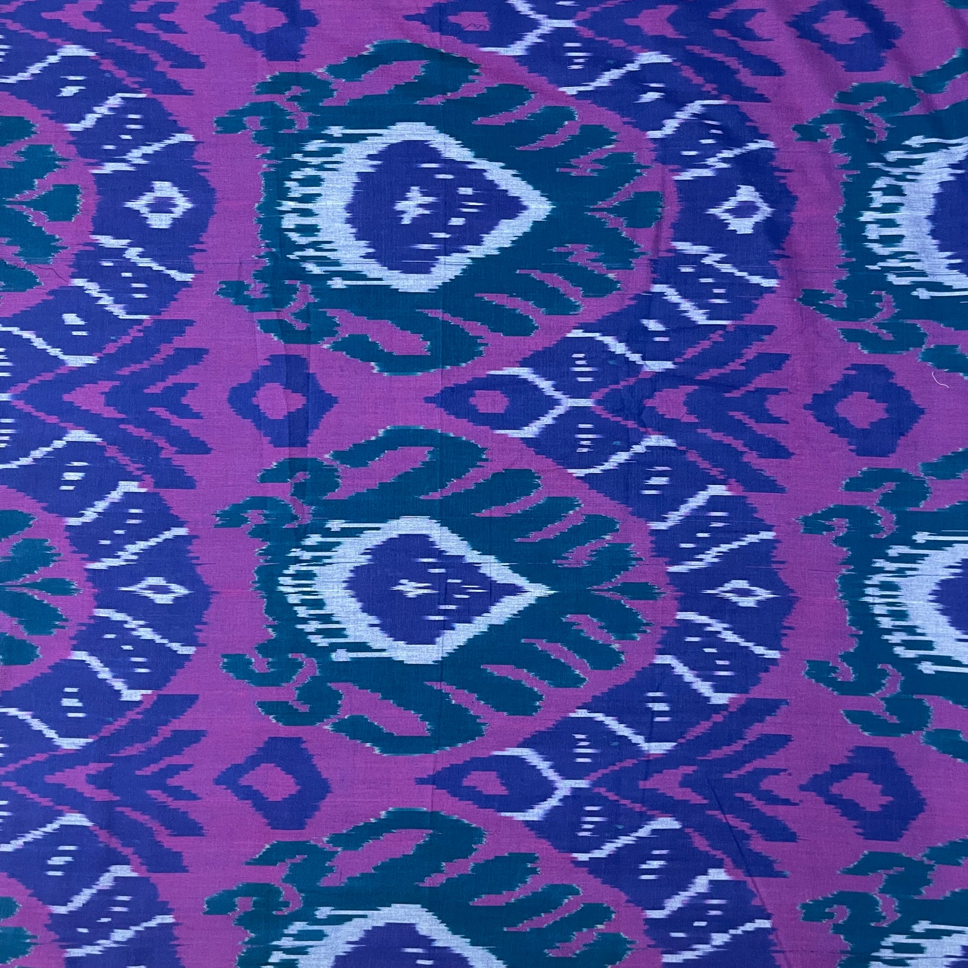 This textile is a proud part of the Pochampally Ikkat tie & dye tradition, known for its vibrant patterns and precise craftsmanship. Woven with pure cotton, the fabric reflects the perfect blend of Indian technique and Central Asian design inspiration, capturing the bold and symmetrical motifs often seen in Uzbek ikats.