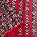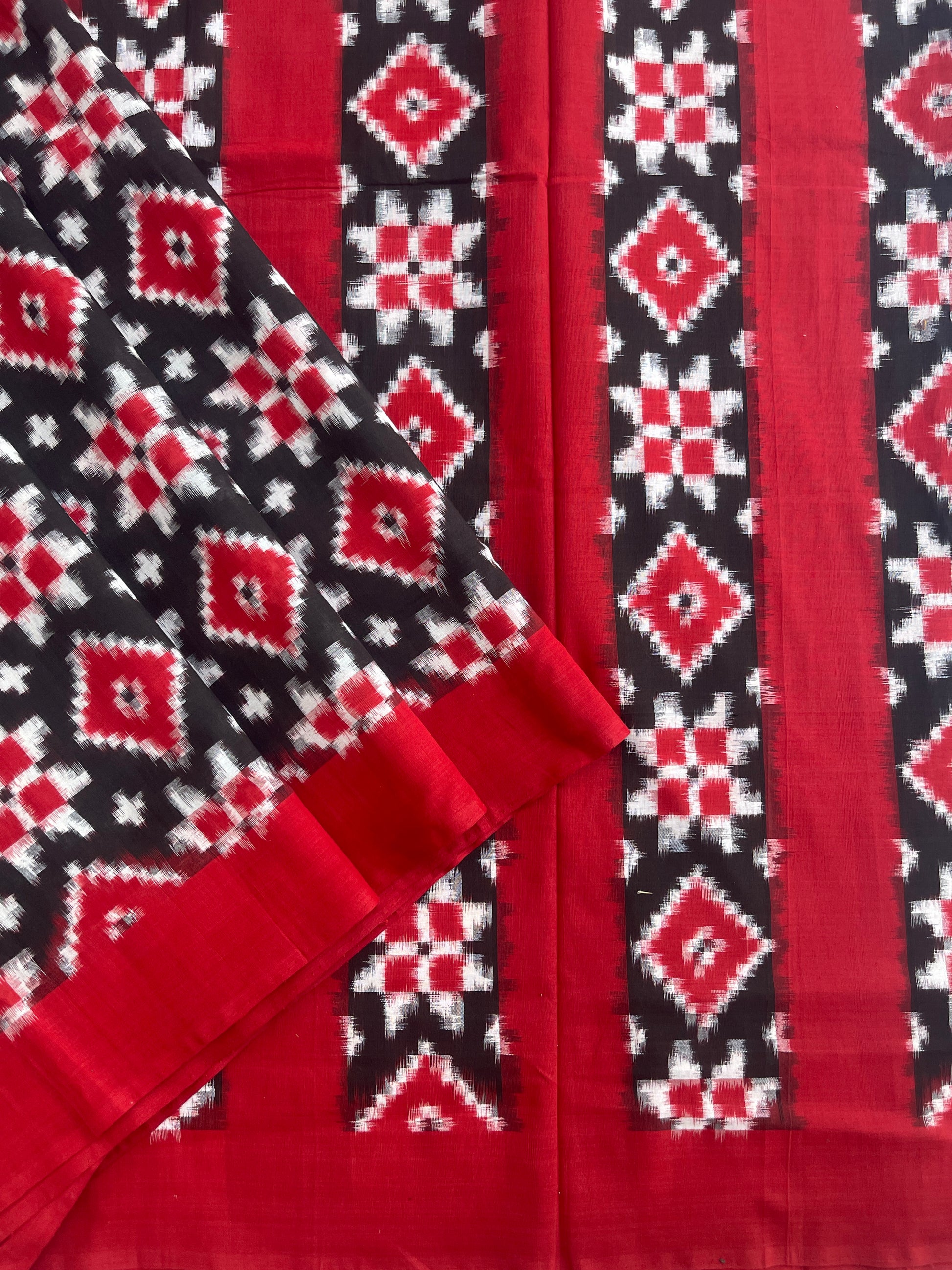 A timeless Red and Black Telia Rumal Cotton Saree, showcasing the rich heritage of traditional handloom weaving. This saree is a classic example of the intricate Telia Rumal craft, known for its precise geometric patterns and deep cultural roots.