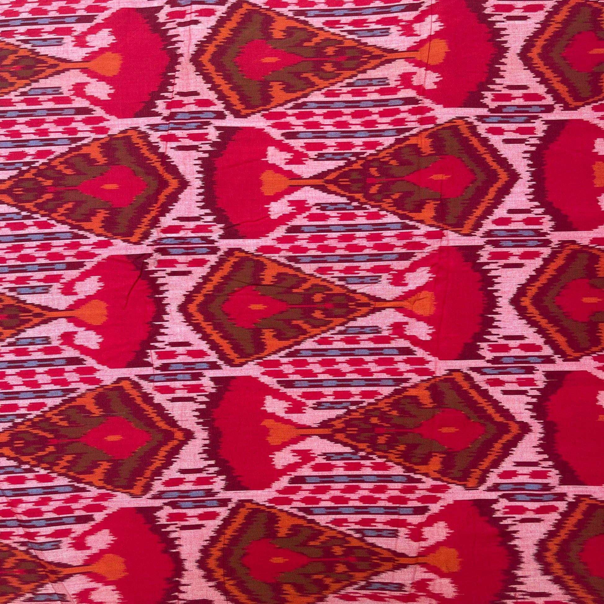 This textile is a proud part of the Pochampally Ikkat tie & dye tradition, known for its vibrant patterns and precise craftsmanship. Woven with pure cotton, the fabric reflects the perfect blend of Indian technique and Central Asian design inspiration, capturing the bold and symmetrical motifs often seen in Uzbek ikats.