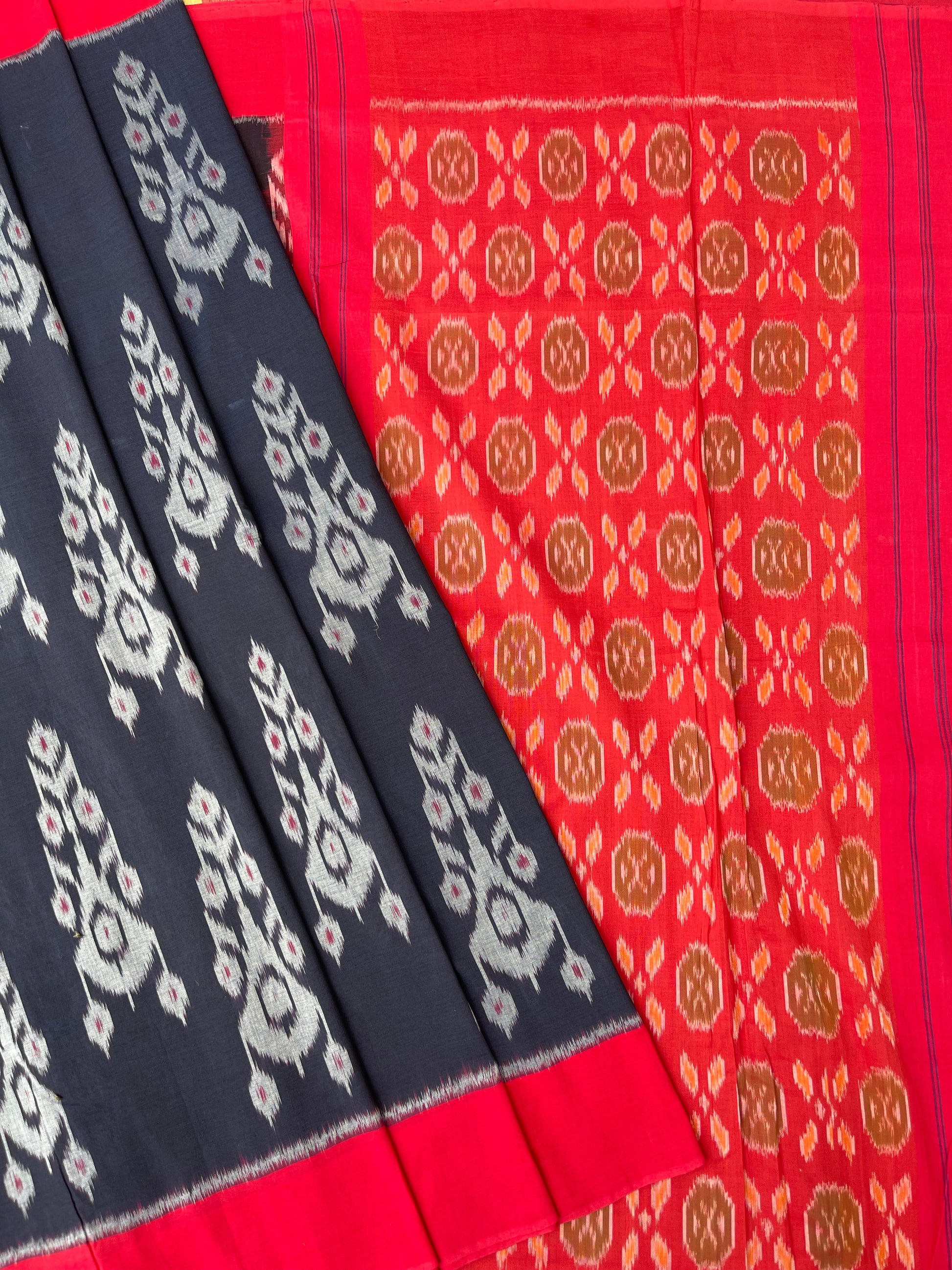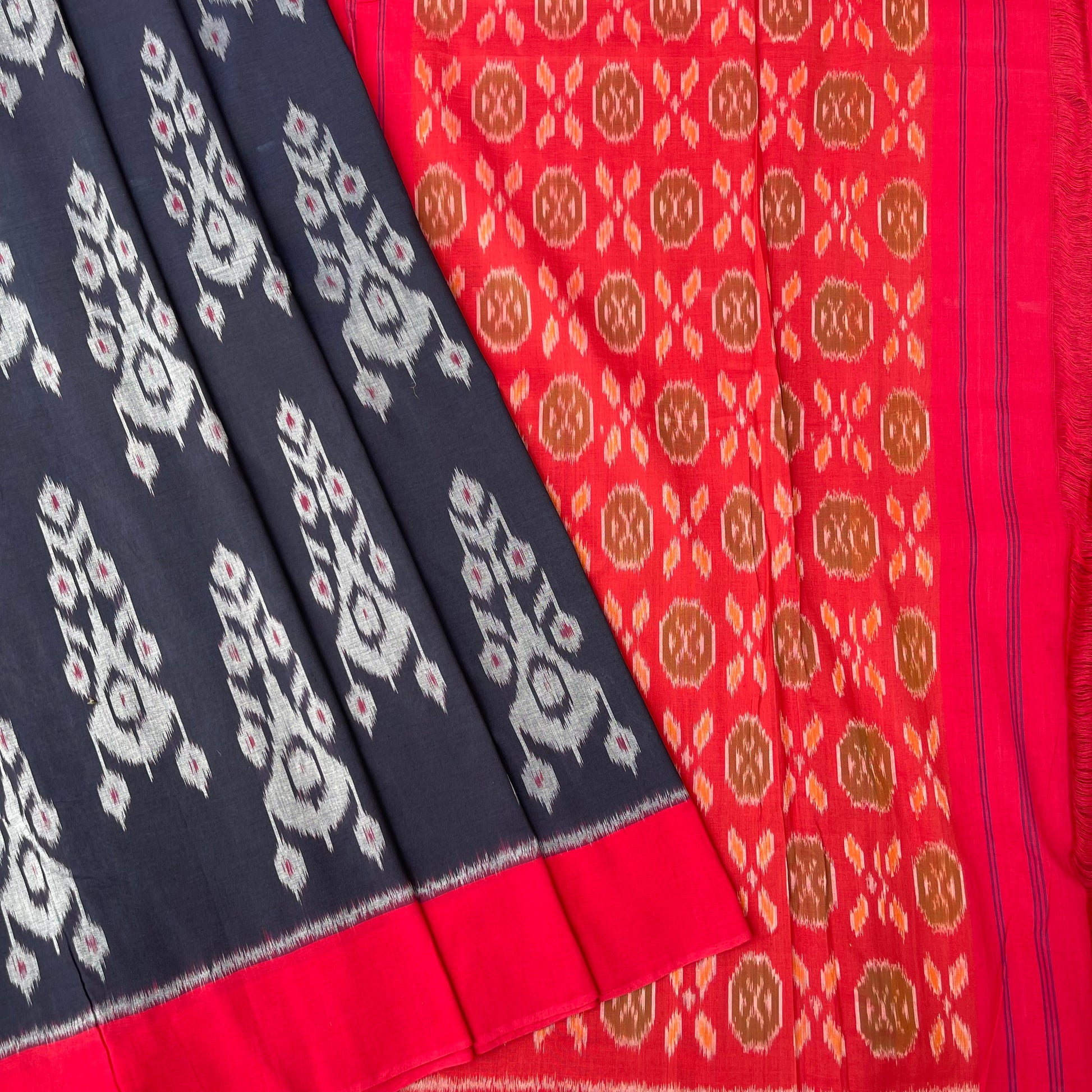 Uzbek ikkat Cotton Saree in Navy Blue & Red